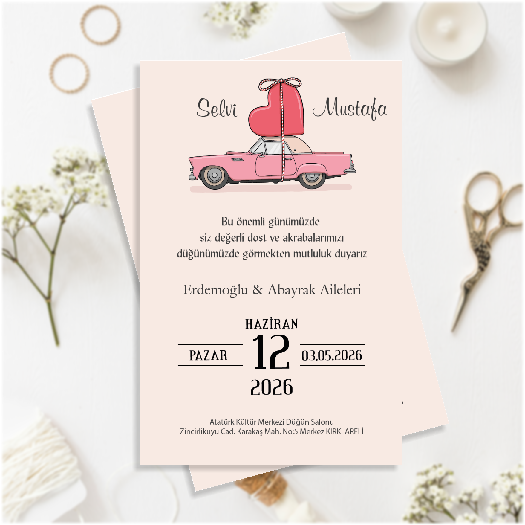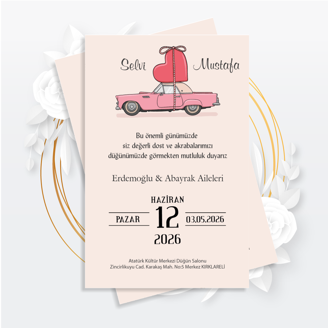 Kişiye Özel Düğün Davetiyesi – Özel Tasarım Araç Temalı 2026