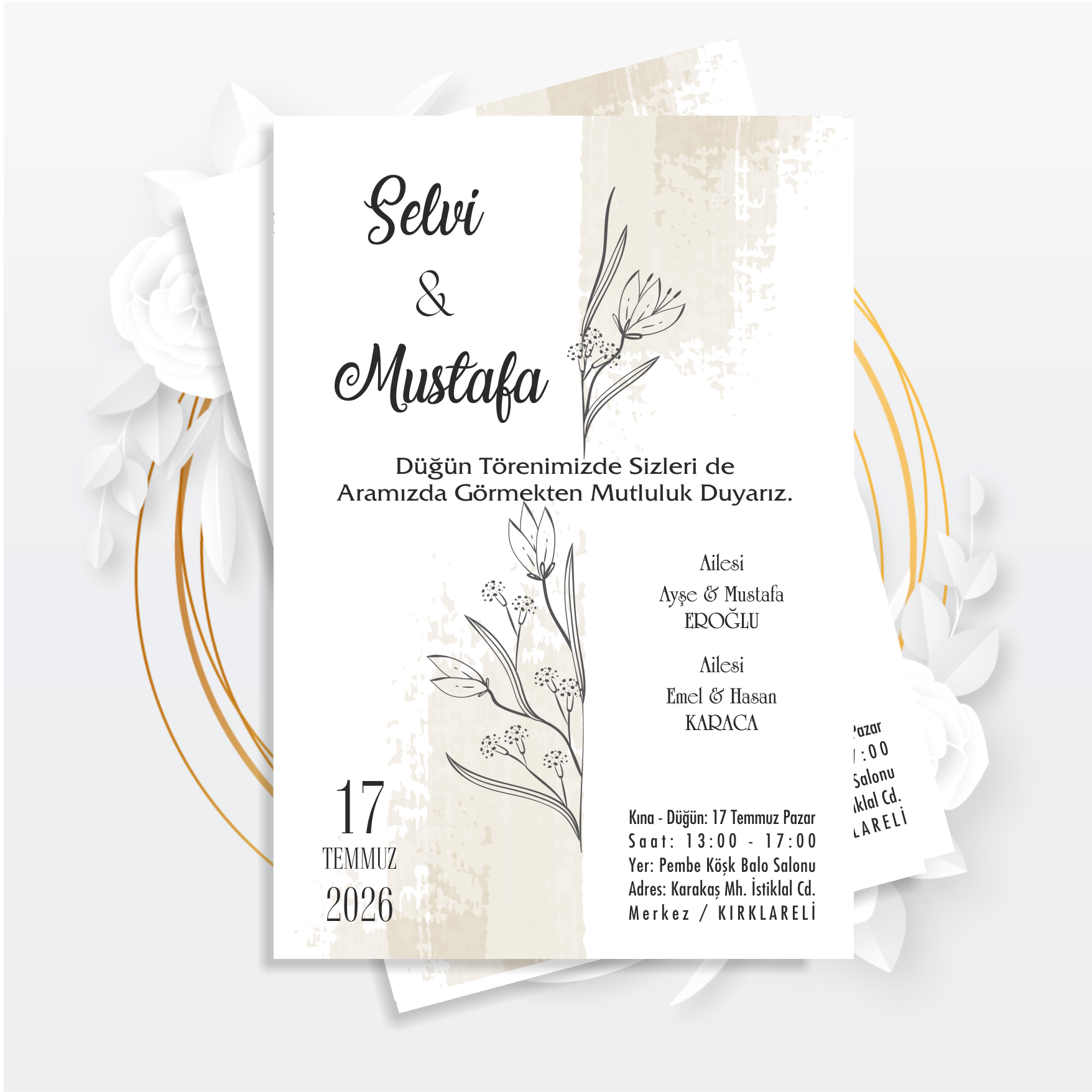 Hayatınızın en özel gününü yansıtacak kişiye özel düğün davetiyesi, modern çizgiler ve şık tasarım anlayışıyla hazırlanır. İsim, tarih, davet metni ve isteğe bağlı ek bilgiler tamamen size özel olarak düzenlenir.